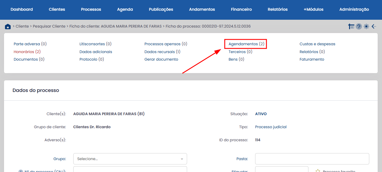 Nesse passo a passo, você verá como criar agendamentos vinculados a um cliente e processo.