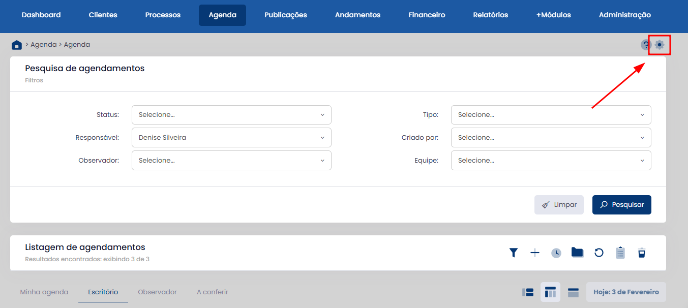 O modo de visualização "Escritório" permite que os usuários autorizados visualizem os agendamentos de todos os usuários. Para habilitar esse modo e definir quais usuários terão acesso, siga o passo a passo abaixo: